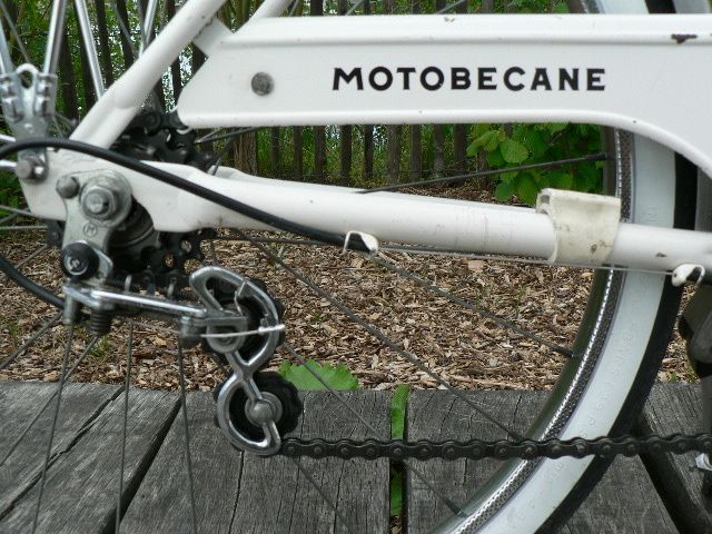 Détail sur le carter de chaine et le séduisant dérailleur arrière Huret Svelto. Une pièce en pastique blanc strié est clipsée sur la base arrière du cadre pour la protéger des sauts de chaîne.