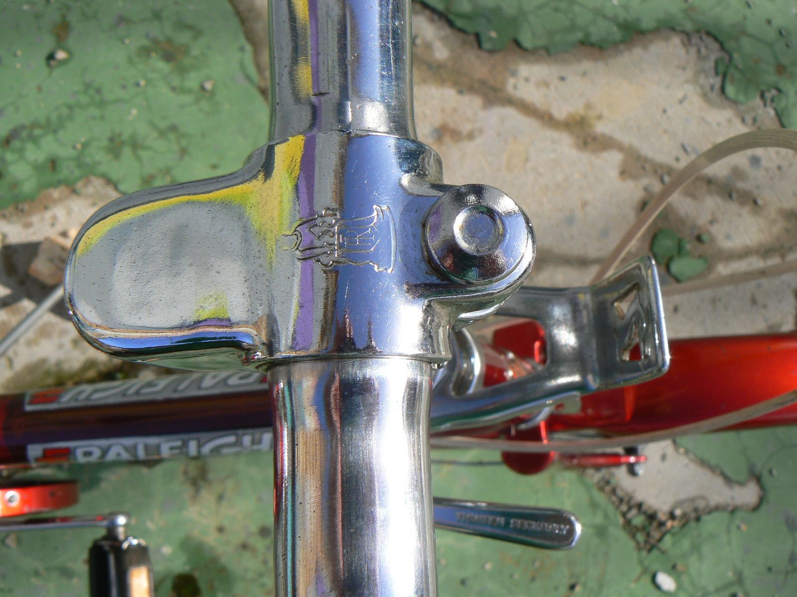 Les chromes sont irréprochables et pour Raleigh, la qualité n'est pas encore sacrifiée en cette fin des années 70. Et on retrouve le héron gravé comme sur cette tête de potence.